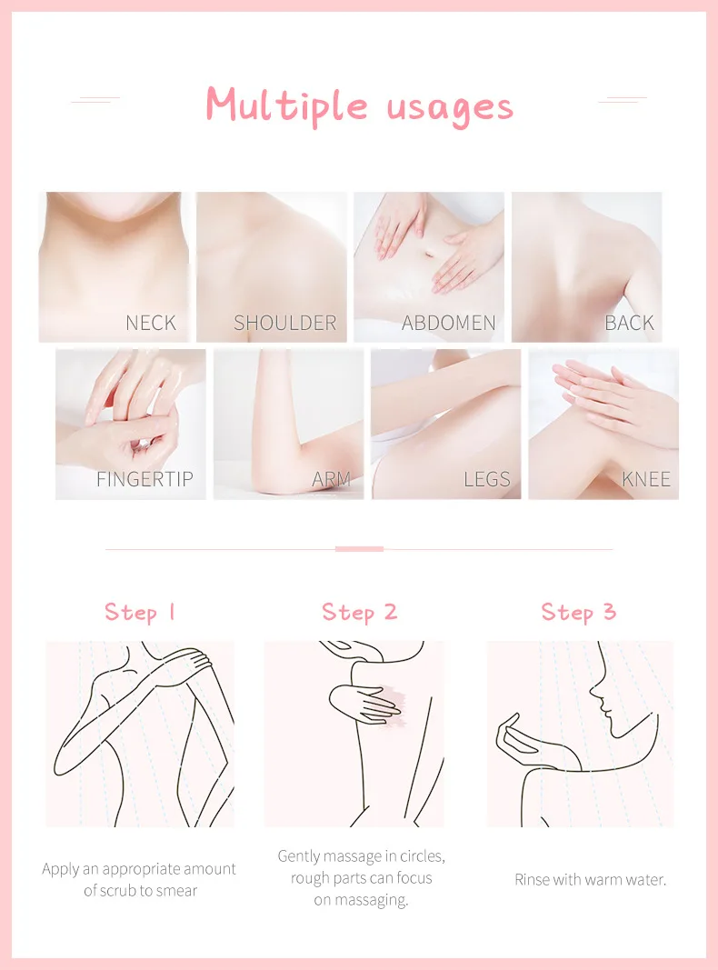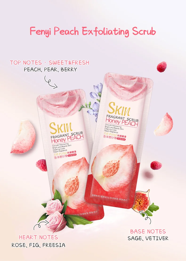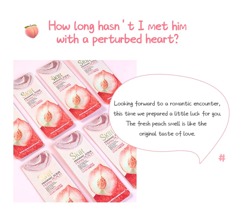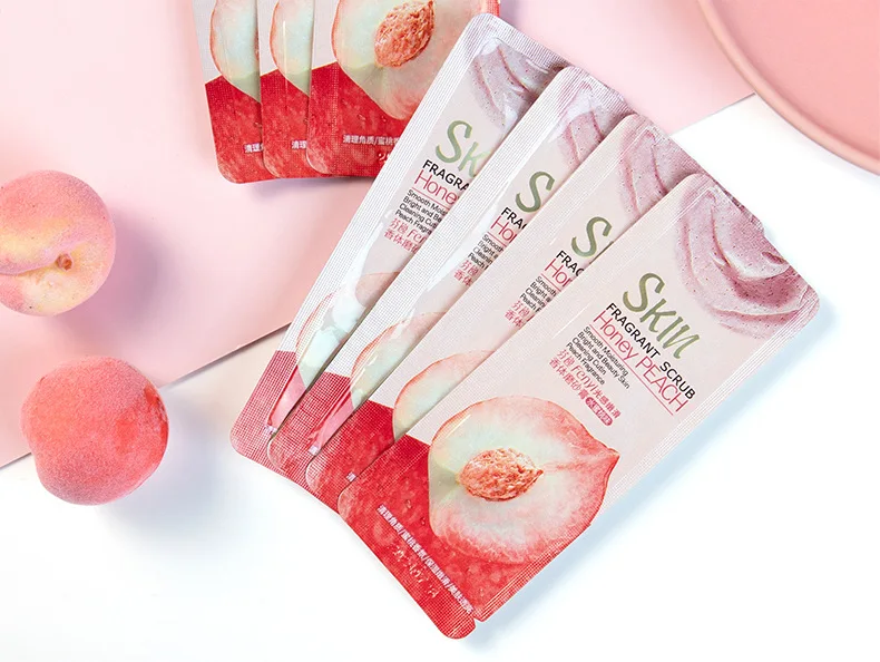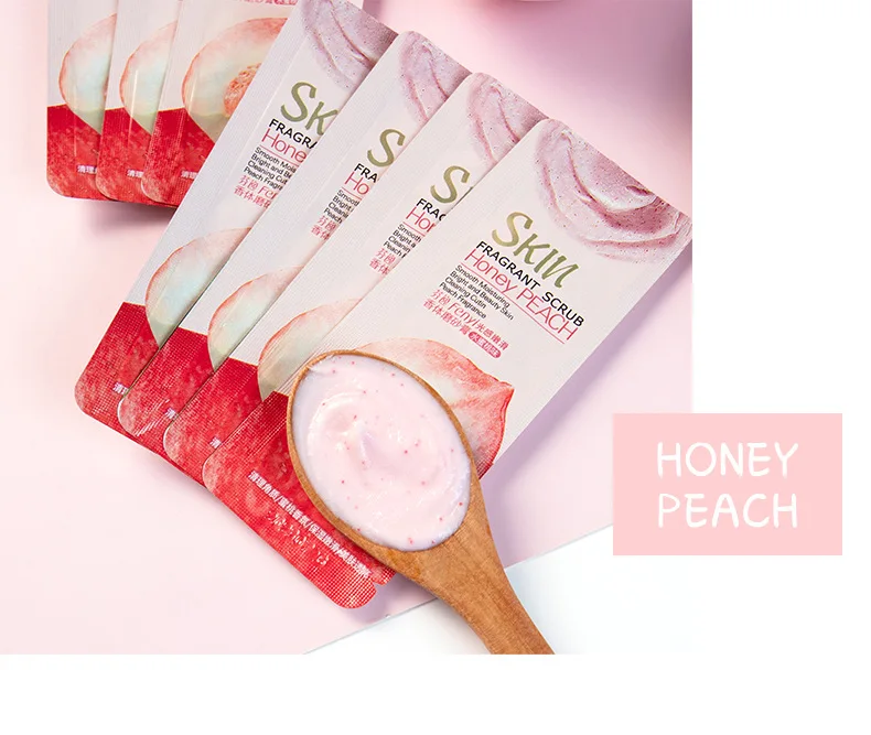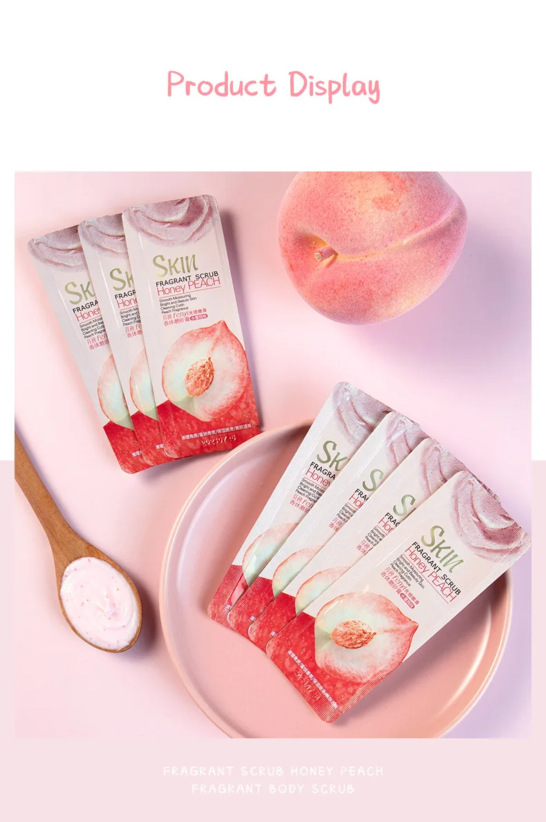Product name: Honey Peach Body Cleansing ScrubMain ingredients: glycerin, nicotinamide, allantoin, arbutin, shea butter extract, milk extract, peach extract.Net weight: 3g/pcsSuitable for: rough, horny skin; suitable for all skin types.Efficacy: fine pores, moisturizing, gentle exfoliation, soft skin